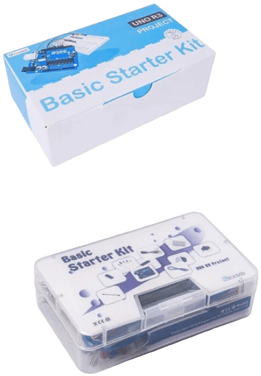 Basic Starter Kit - стартовый набор, который включает в себя различные электронные компоненты, в том числе плату контроллера UNO R3, чип 74HC595 и светодиоды, 4-значный дисплей, шаговый и серводвигатель, а также резисторы, переключатели и другие элементы для создания работающей системы.