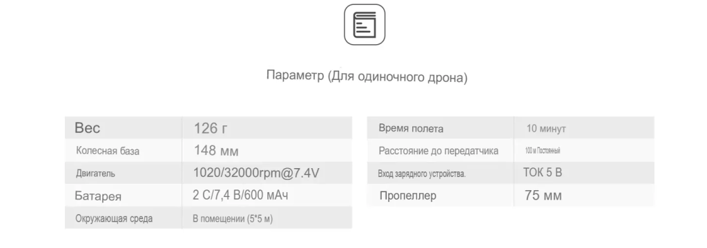 Комплектация | Набор дронов -10 шт STEM / Зарядное устройство для литиевых батарей х 10 / Коврик с QR-кодами х 1 / Маршрутизатор х 1 / Литиевая батарея х 16 / Модуль позиционирования х 10 / Фонари х 10 / Соединительный кабель х 10 / Зарядная база х 10 / Кабель микро-USB х 10 / Ключ для пропеллеров х 1 / Инструкция х 1 / Кейс транспортировочный х 1 / Запасные винты (по часовой стрелке / против часовой стрелки по 2 шт.) х 10 / Запасные моторы (по часовой стрелке / против часовой стрелки по 2 штуки) х 8 / Запасные штифты (стандарт: 100 | половина: 10) х 4 / Руководство |