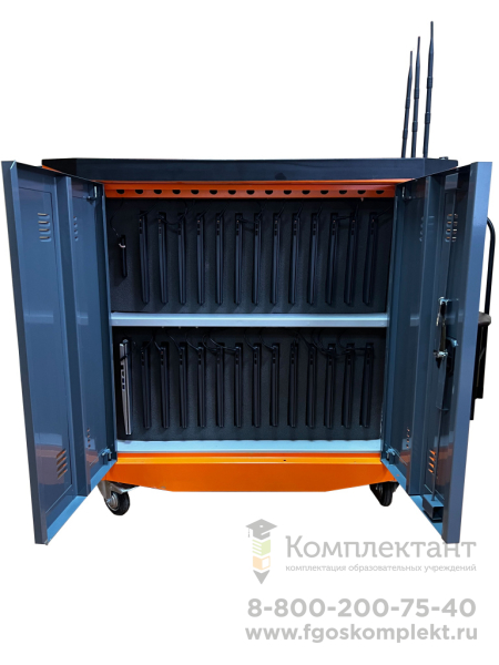 Металлический корпус мобильной тележки внутри разделен на два отсека с ложементами для размещения ноутбуков. Внутреннее отделение закрывается двумя дверьми с ригельным замком. В верхней части каждого отсека закреплен специальный кабель-канал для укладки и фиксации проводов зарядных устройств. Группы зарядных устройств, контроллер зарядки, встроенная беспроводная система и другое оборудование располагаются в технических отсеках мобильной тележки.
