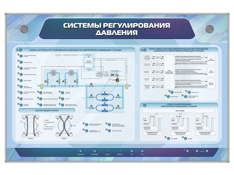 Электрифицированный стенд "Системы регулирования давления" предназначен для получения знаний об особенностях построения систем регулирования давления нефти в магистральном нефтепроводе и представляет полноцветную светодинамическую панель, на которой размещена информация о составе системы регулирования давления нефти, обеспечивающей синхронизацию режимов работы насосных станций, с кратким описанием входящих в нее элементов.