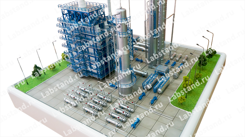 Стационарный интерактивный макет на мобильной платформе позволяет изучать последовательность и логистику технологических процессов атмосферного блока переработки нефти с возможностью сенсорного ввода и управления, отображать трехмерные разрезы выбранного элемента оборудования на дисплее макета.