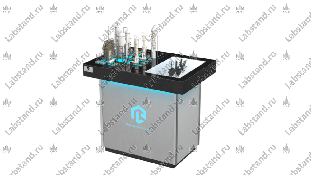Реализованы элементы оборудования в электронном виде, так и в дополненной наглядной физической части, выполненной из легко обрабатываемых материалов с применением технологии трехмерной печати. Стационарный интерактивный макет на мобильной платформе позволяет изучать последовательность и логистику технологических процессов переработки нефти и газа. Технические характеристики стенда: питание от сети переменного тока, напряжение 220 ± 22 В; частота 50 Гц; потребляемая мощность, не более, 1000 Вт.; Вес, не более, 120 кг; Габаритные размеры, не более, 1200х900х1200 мм.
