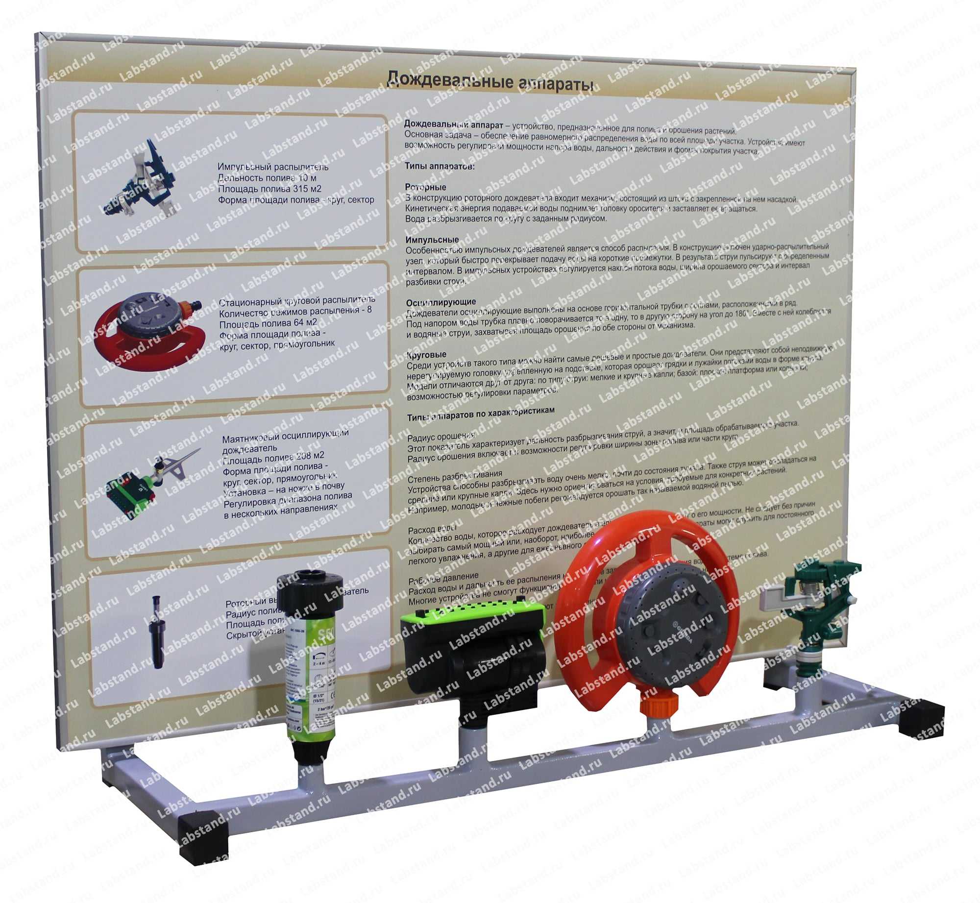 Назначение: Стенд-планшет предназначен для изучения конструкции составных элементов дождевальных аппаратов.