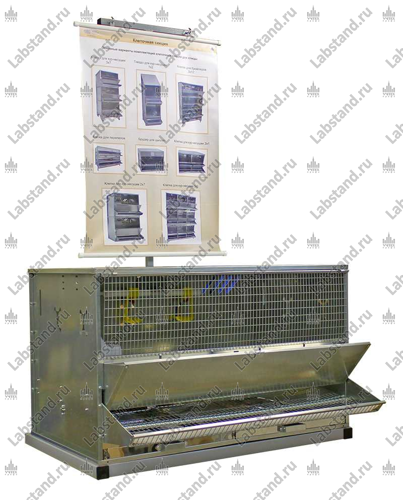 Назначение: Демонстрационный макет «Клеточная секция» предназначена для изучения устройства и принципов функционирования составных элементов оборудования для содержания кур несушек.