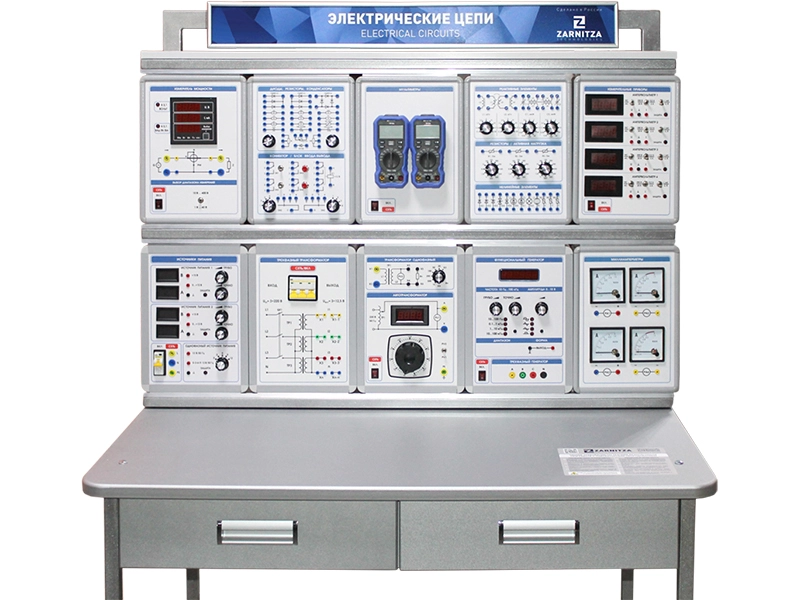Комплект учебно-лабораторного оборудования "Электрические цепи" предназначен для проведения лабораторно-практических занятий по одноименной дисциплине, обеспечивает изучение и исследование электрических цепей постоянного и переменного тока, трехфазных цепей, переходных процессов в линейных и нелинейных электрических цепях, полупроводниковых приборов, выпрямителей и сглаживающих фильтров.