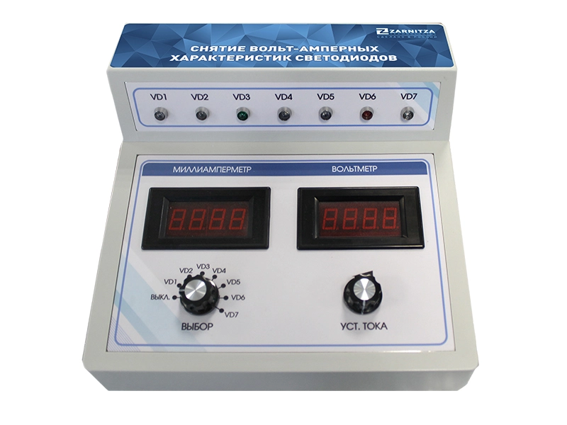 Комплект учебно-лабораторного оборудования "Снятие вольт-амперных характеристик светодиодов" представляет собой установку настольного исполнения с ручным управлением, содержащую встроенные: регулируемый источник тока, семь видов светодиодов, миллиамперметр и вольтметр, служащие для снятия вольт-амперных характеристик светодиодов.