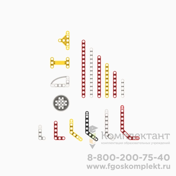 В комплект входят 52 детали, среди которых балки и шестерни.