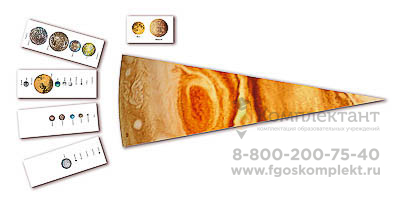 Комплектность: карточка с изображением сектора Солнечного диска – 1 шт., карточка с изображением сектора диска Юпитера – 1 шт., карточка с изображениями планет земной группы: Меркурия, Венеры, Земли и Марса – 1 шт., карточка с изображением Юпитера – 1 шт., карточка с изображением Сатурна – 1 шт., карточка с изображением Урана – 1 шт., карточка с изображением Нептуна – 1 шт., карточки с изображением веса человека на разных планетах – 4 шт., карточка с изображением Меркурия и Луны – 1 шт., карточка с изображениями спутников Юпитера – 1 шт., карточка с изображениями спутников Сатурна – 1 шт., карточка с изображениями спутников Урана – 1 шт., карточка с изображениями спутников Нептуна – 1 шт., руководство по эксплуатации с методическими рекомендациями – 1 шт.