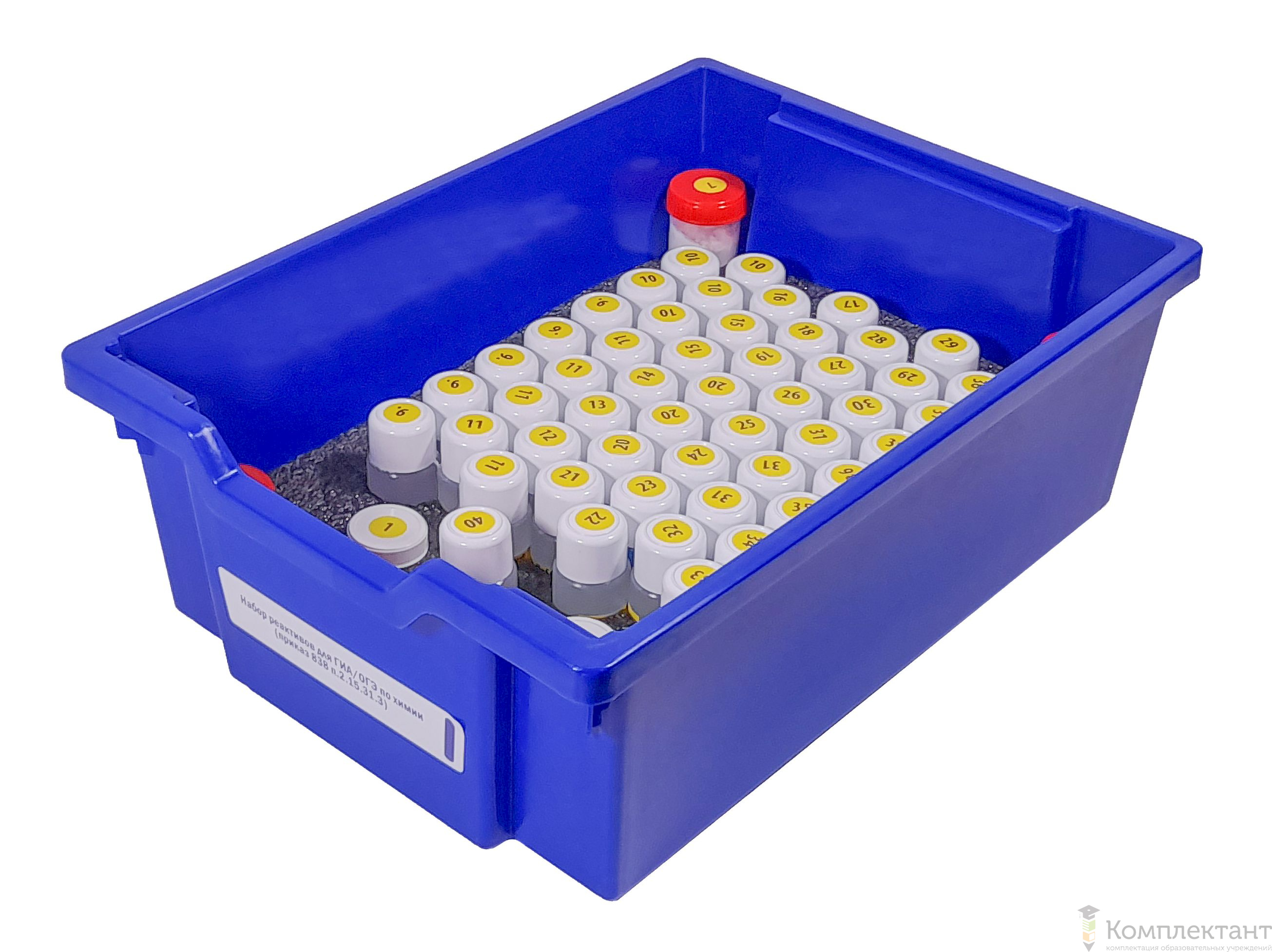 Сухие вещества в пластиковых баночках с завинчивающейся крышкой. Все флаконы и баночки с реактивами имеют наклейку с названием и формулой вещества внутри.