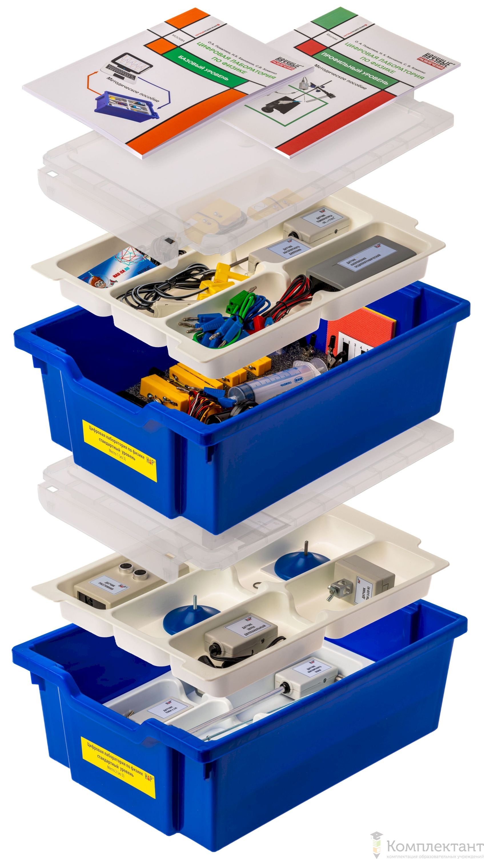 Все оборудование цифровой лаборатории (кроме скамьи лабораторной) укомплектовано в пластиковые системы хранения, которые закрываются прозрачной пластиковой крышкой на защелках для обеспечения наблюдения за содержимым. Комплект оборудования и датчики в системах хранения располагаются на ложементах в индивидуальных ячейках.