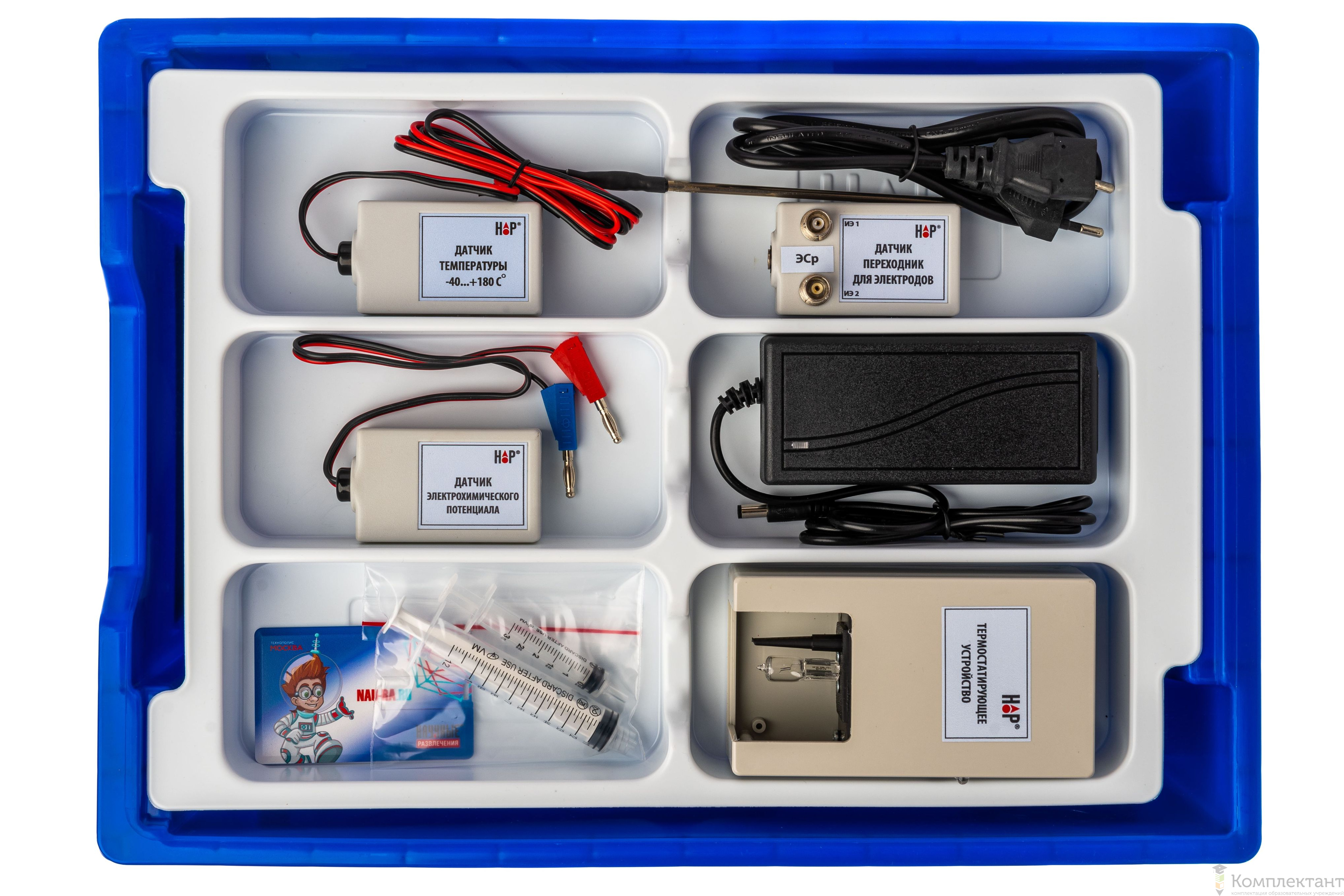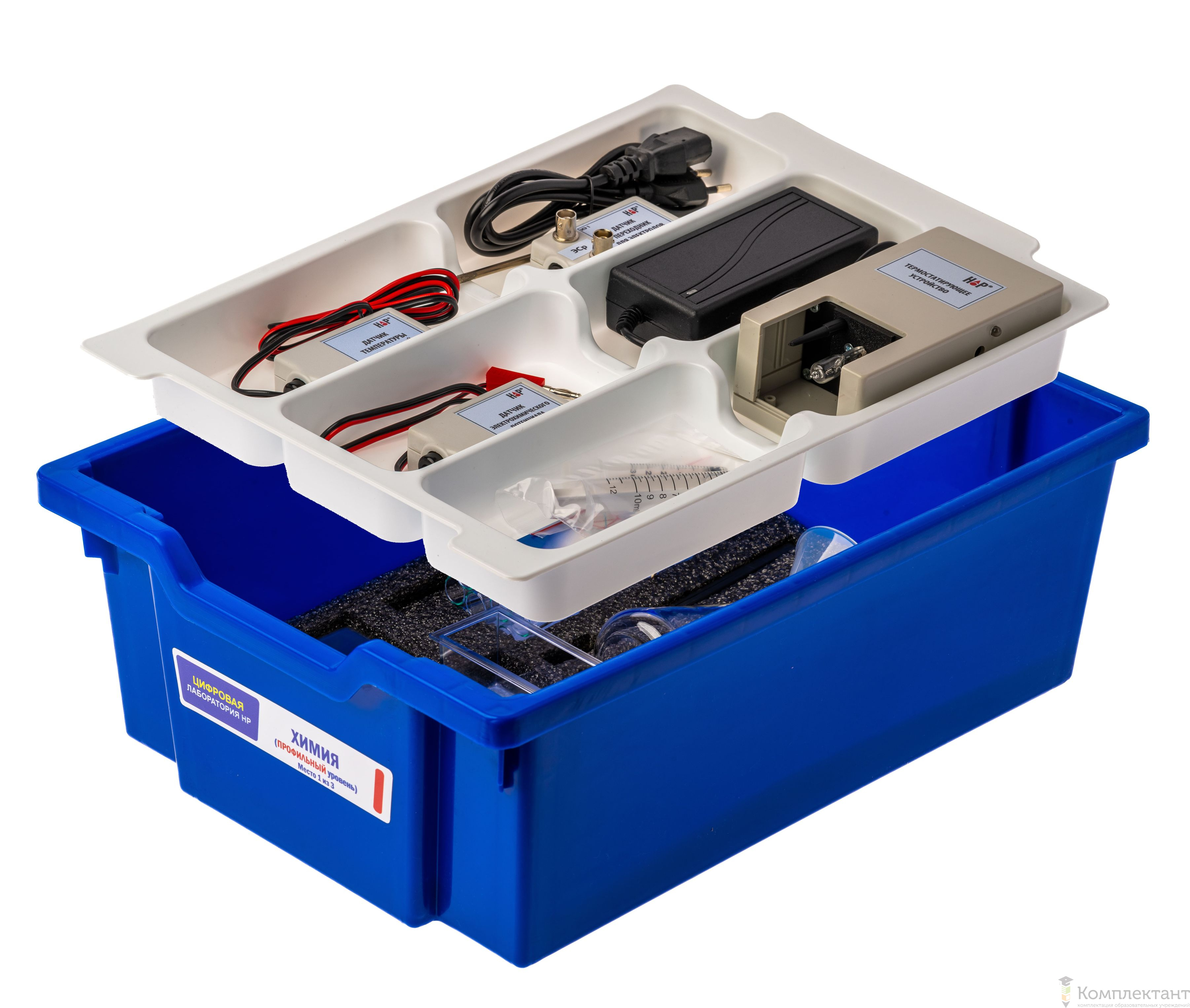 Цифровая лаборатория укомплектована в пластиковую систему хранения, которая закрывается прозрачной пластиковой крышкой на защелках для обеспечения наблюдения за содержимым. Комплект оборудования и датчики в системе хранения располагаются на ложементах.